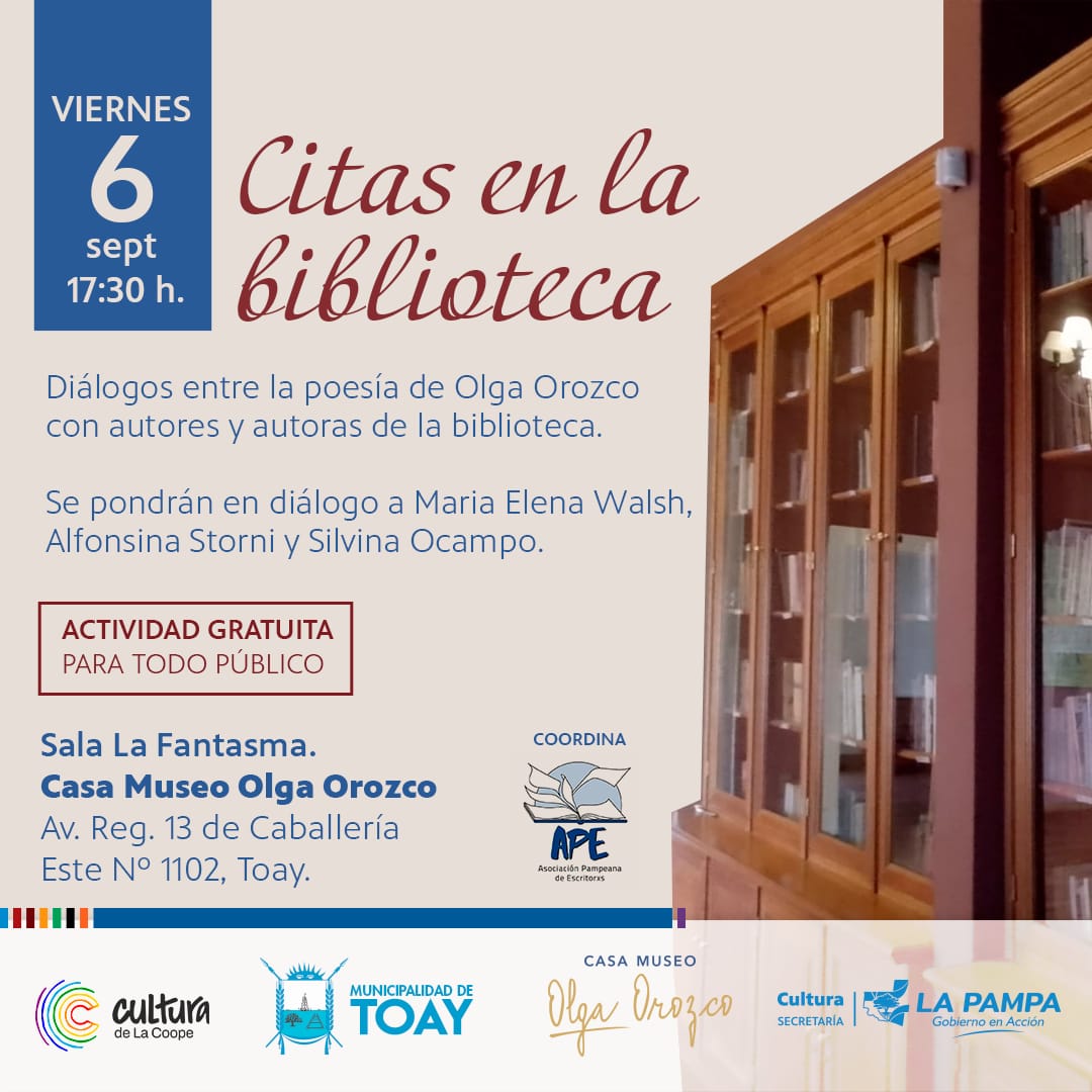 Es una actividad gratuita y abierta para todo público que se llevará a cabo con la coordinación de APE (Asociación Pampeana de Escritores), el próximo viernes 6 de septiembre a las 17:30hs. en la Sala “La Fantasma” de la Casa Museo Olga Orozco, Toay.