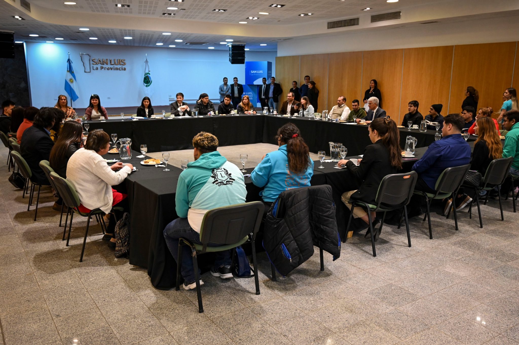 El gobernador Claudio Poggi fue el anfitrión de un desayuno con egresados de escuelas especiales y estuvo acompañado por el ministro de Educación, Guillermo Araujo; el secretario de Estado de Personas con Discapacidad, Luis Giraudo; la directora de Becas y Beneficios Estudiantiles, Candela Escudero y el subdirector de Educación Especial, Federico Gonzáles.